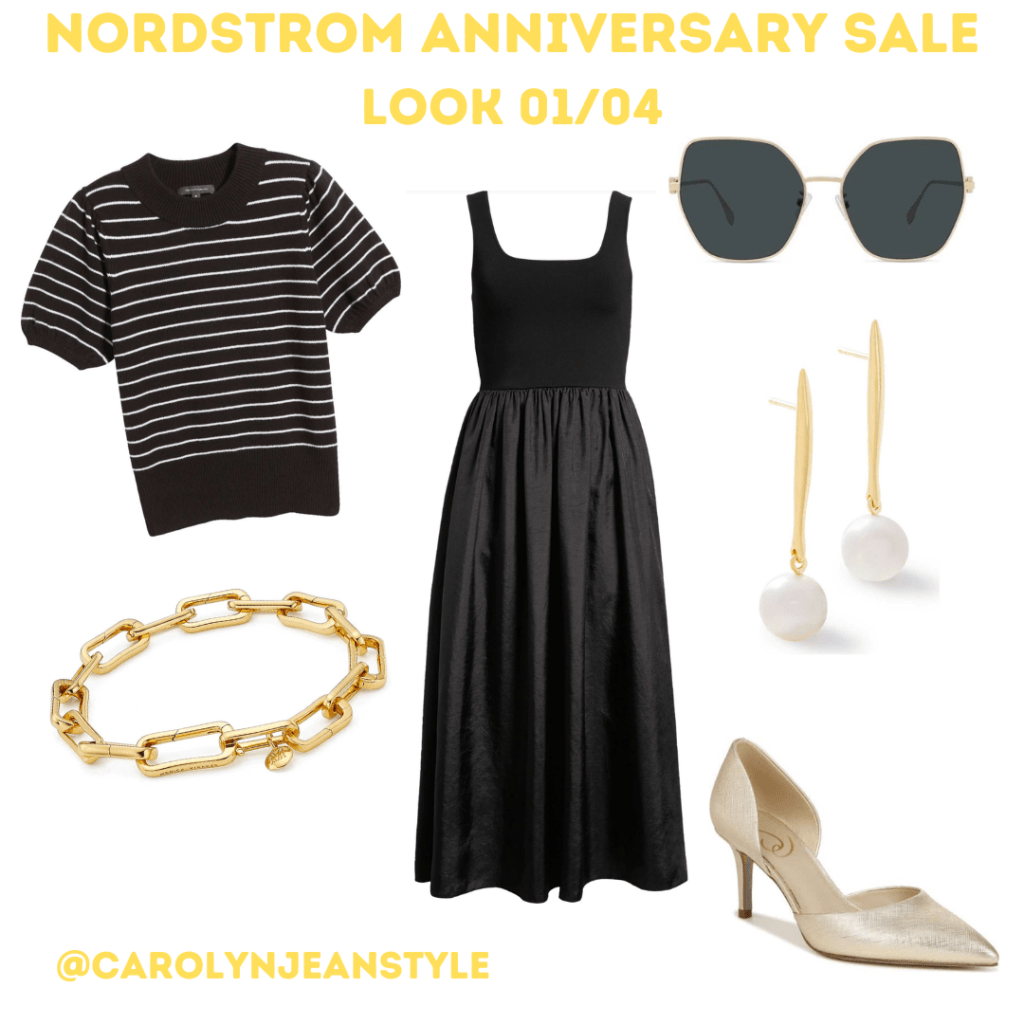 This mixed media black dress is a great option to either dress up or down and can take you from summer right into fall. Adding some delicate accessories and pointy toe heels, it can be dressed up for dinner at your favorite restaurant. I’ve included the short-sleeved sweater that you can throw on over it for those cooler nights or pair with flats for a casual fall look.