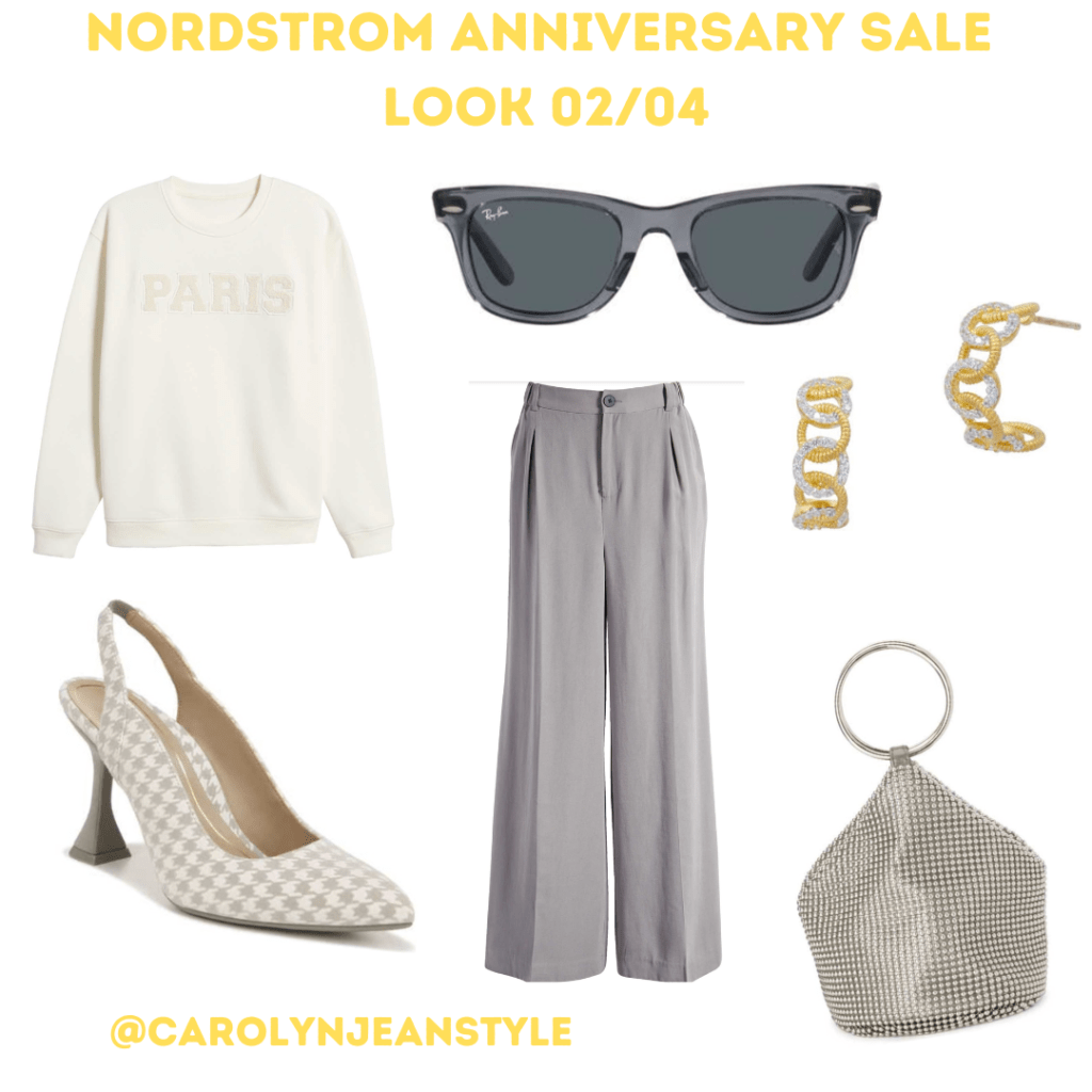 I think this is one of my favorite outfits from the sale. I’m loving the wide leg pants paired with the sweatshirt and those heels. With some fun accessories this will be great for a more casual date without feeling too dressed down.