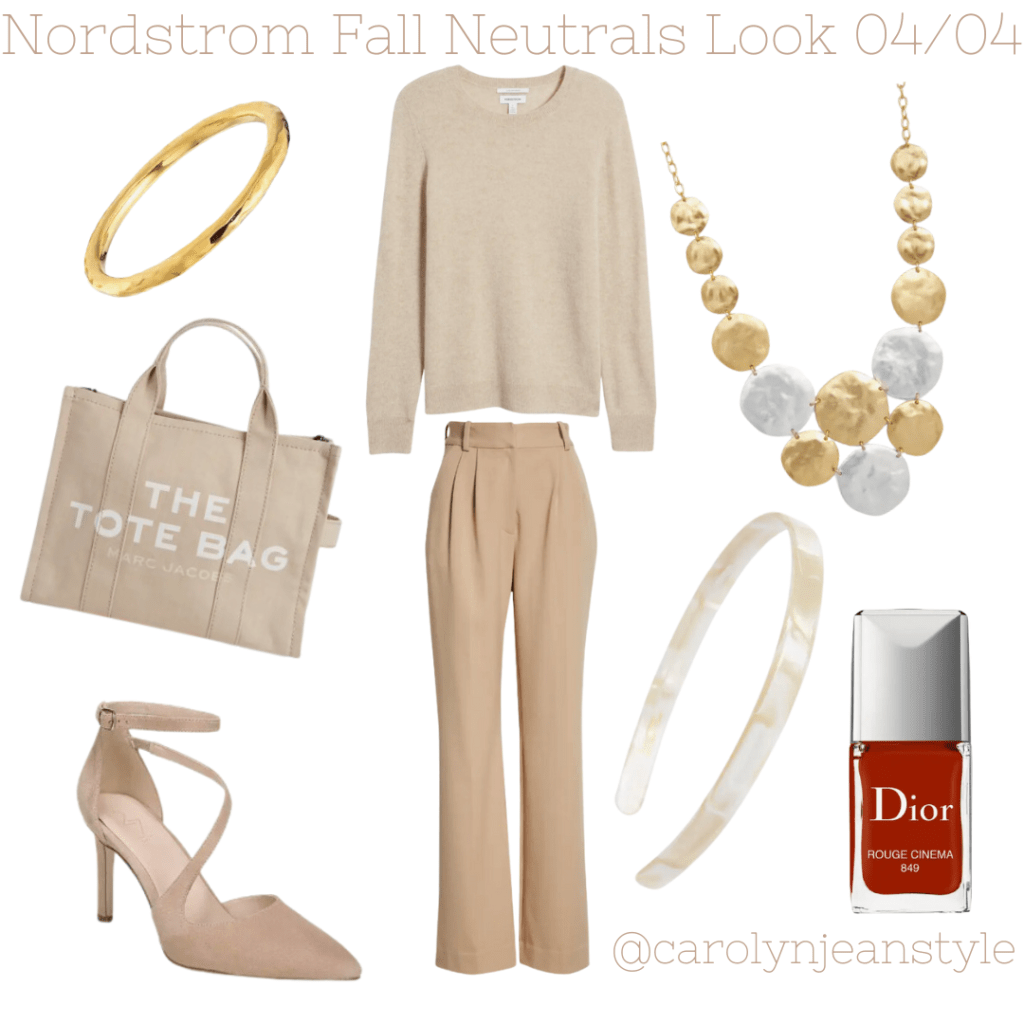 The epitome of a neutral outfit. Head to toe in a classic beige mixed with a statement necklace and classic red nail…perfection!
