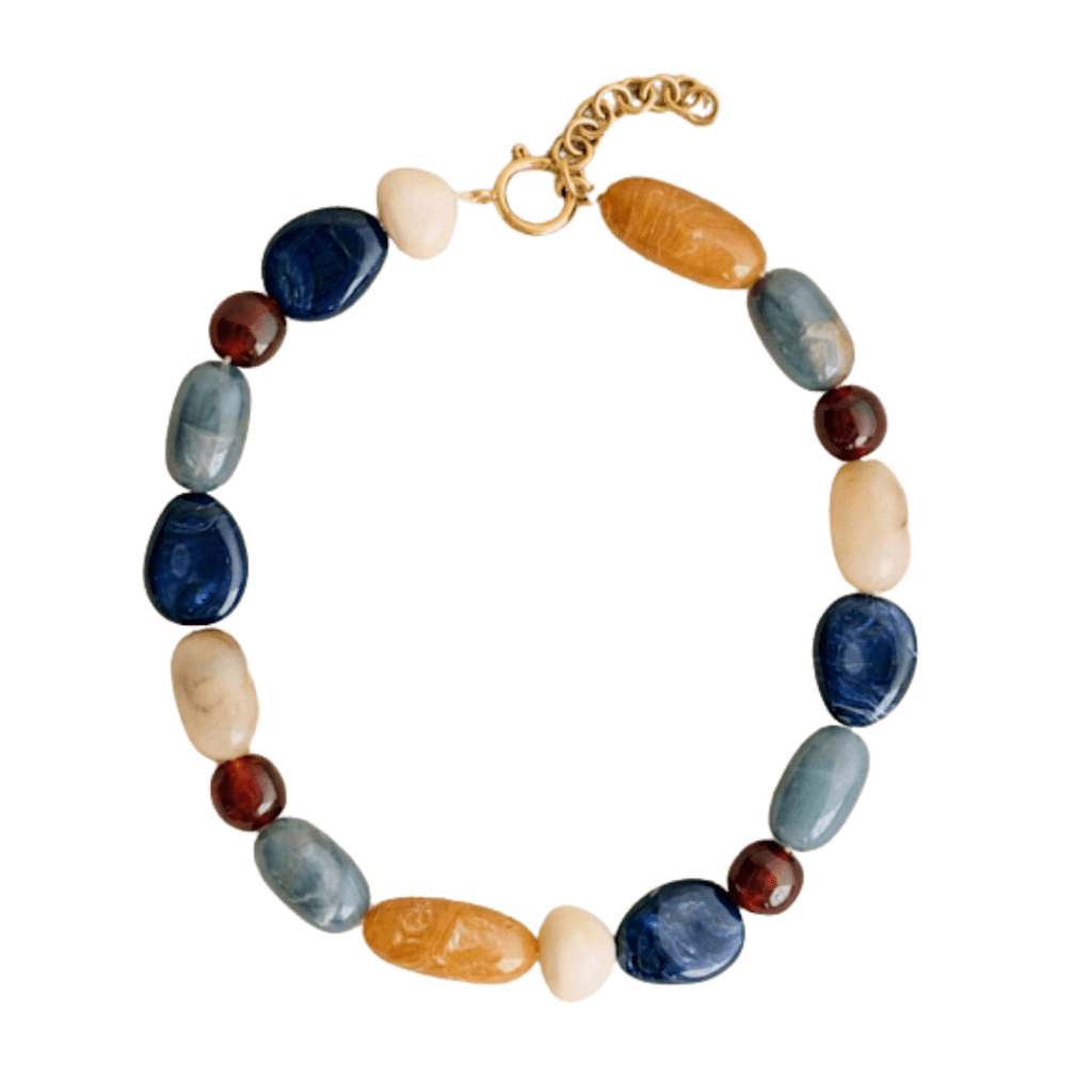 Chunky beaded necklaces are here to stay this season. This one speaks to me and says summer in all the best ways possible. The different shades of blue remind me of the sky meeting the ocean. The khaki stones are the sun and sand. And the icing on the cake is that slight pop of burgundy. LOVE!